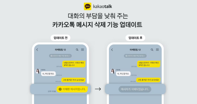 카카오톡이 메시지 삭제 가능 시간을 5분에서 24시간으로 늘리고, 누가 삭제했는지 알 수 없도록 변경했다. 메시지 삭제 기능 도입 후 7년 만의 개편이다. 카카오는 대화의 부담감을 낮추고 원활한 소통 환경을 조성하기 위해 삭제 기능을 개선했다고 밝혔다.