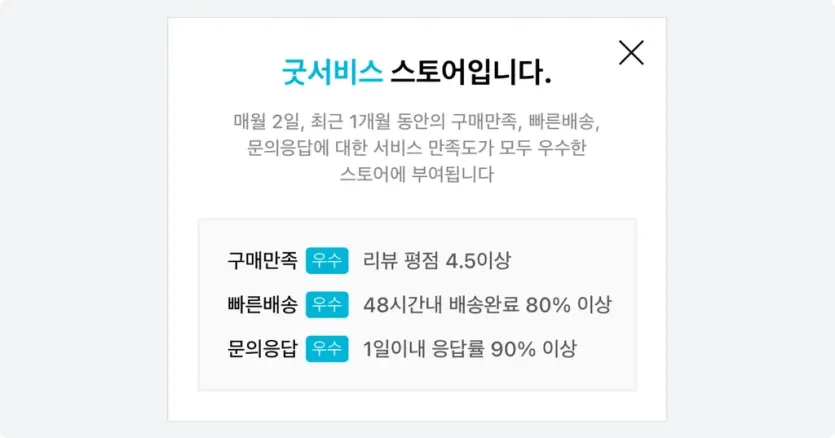 네이버가 스마트스토어 판매자 센터를 통해 기존 굿서비스 프로그램을 ‘굿서비스 점수’로 개편한다고 밝혔다. 기존 프로그램이 고객 리뷰, 배송, CS 응답률 등 항목 충족 여부를 확인하는 수준에 그쳤다면, 새 제도는 이를 점수화해 AI 추천 및 검색 노출에 반영할 예정이다.